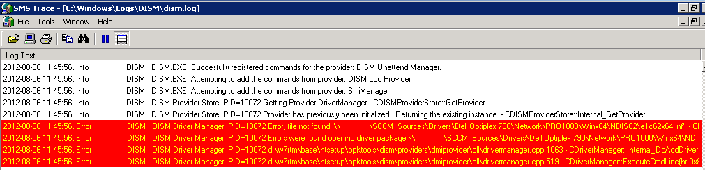 Zum Ermitteln der Fehlerursache hilft ausnahmsweise kein Log im CM Verzeichnis, da das Hinzufügen von Treibern mittels des WAIK erfolgt bzw. genauer mit dism.exe. Dieser Tool legt seine Logfile unter Windows\Logs\Dism\dism.log ab. In diesem Fall sieht man dort folgendes:
